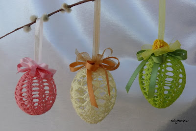 Koszulki, które są umieszczone na plastikowych jajkach wykonane są z kordonka poliestrowego. No może kolory tych kordonków nie są zbyt świąteczne ale za to ładnie się błyszczą :)))